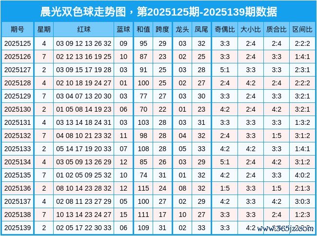 双色球第2025139期红球奖号为:02 05 17 22 30 33 ;蓝球06。红球号码质合比为3:3,奇偶比为3:3,三区比为2:2:2。